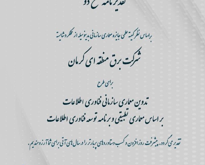 در پنجمین همایش ملی پیشرفت های معماری سازمانی، شرکت برق منطقه ای کرمان براساس نظر کمیته علمی جایزه معماری سازمانی موفق به کسب “تقدیر نامه سطح دو” شد.