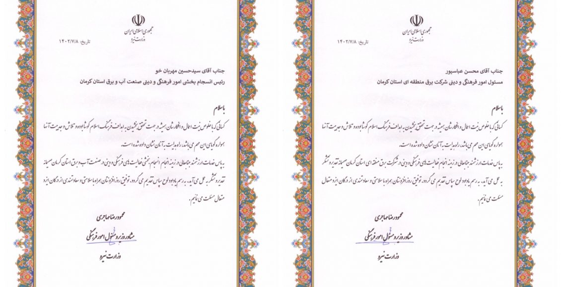طی لوح های جداگانه ای به امضای محمودرضا مهاجری مشاور وزیر و مسئول امور فرهنگی وزارت نیرو از محسن عباسپور مسئول امور فرهنگی و دینی شرکت برق منطقه ای کرمان و سید حسین مهربان خو رئیس انسجام بخشی امور فرهنگی و دینی صنعت آب و برق استان کرمان تقدیر به عمل آمد.