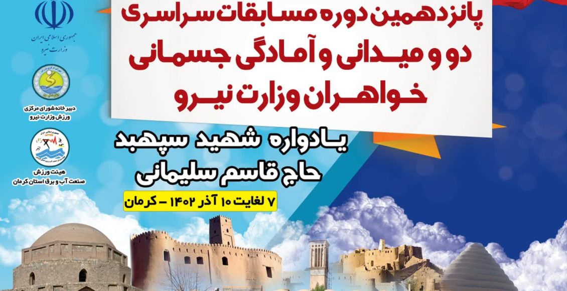 صنعت آب و برق کرمان میزبان پانزدهمین دوره مسابقات دو و میدانی و آمادگی جسمانی خواهران وزارت نیرو یادوراه شهید حاج قاسم سلیمانی می باشد. این مسابقات در تاریخ 7 لغایت 9 آذر ماه (روزهای چهارشنبه و پنجشنبه) در محل ورزشگاه امام علی(ع) و سالن فجر کرمان برگزار می گردد. مهندس داریوش عوض پور دبیر اجرایی این مسابقات اظهار داشت: این مسابقات طبق تقویم ورزشی و آئین نامه اجرایی وزارت نیرو و در رشته های دومیدانی شامل؛ رشته های دو سرعت، دو استقامت و دو امدادی در 4 رده سنی و رشته آمادگی جسمانی در 6 رده سنی و با حضور 180 ورزشکار برگزار خواهد شد.