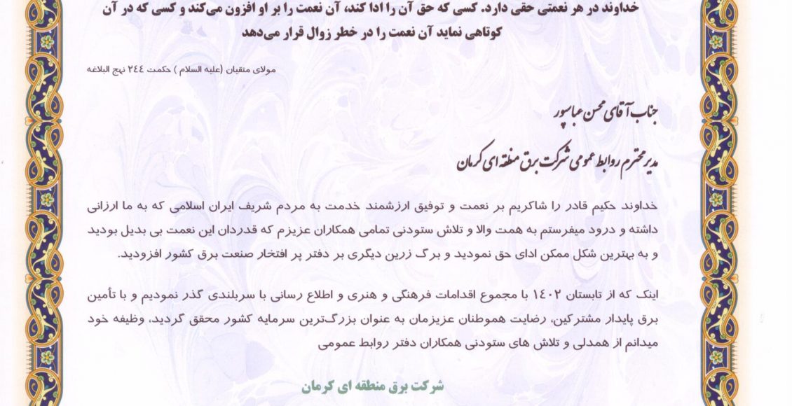 در بخشی از لوح تقدیر اهدایی از سوی مهندس علی اکبری مدیرکل دفتر روابط عمومی و امور بینالملل شرکت توانیر به محسن عباسپور، مدیردفتر روابط عمومی آمده است: خداوند حکیم و قادر را شاکریم بر نعمت و توفیق ارزشمند خدمت به مردم شریف ایران اسلامی که به ما ارزانی داشته و درود میفرستم به همت والا و تلاش ستودنی تمامی همکاران عزیزم که قدردان این نعمت بیبدیل بودید و به بهترین شکل ممکن ادای حق نمودید و برگ زرین دیگری بر دفتر پرافتخار صنعت برق کشور افزودید. اینک که از تابستان ۱۴۰۲ با مجموع اقدامات فرهنگی و هنری و اطلاعرسانی با سربلندی گذر نمودیم و با تامین برق پایدار مشترکین، رضایت هموطنان عزیزمان به عنوان بزرگترین سرمایه کشور محقق گردید، وظیفه خود میدانم از همدلی و تلاشهای ستودنی همکاران دفتر روابط عمومی شرکت برق منطقه ای کرمان که شایسته تقدیر ویژه میباشد سپاسگزاری و قدردانی نمایم.