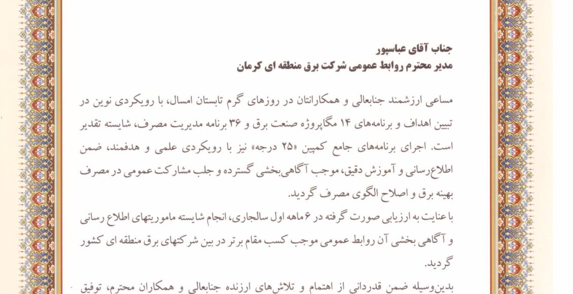 در این تقدیرنامه همچنین تأکید شده است که روابط عمومی برق منطقهای کرمان با اجرای شایسته مأموریتهای اطلاعرسانی و آگاهیبخشی توانسته است در میان شرکتهای برق منطقهای کشور، جایگاه برتر را به دست آورد.