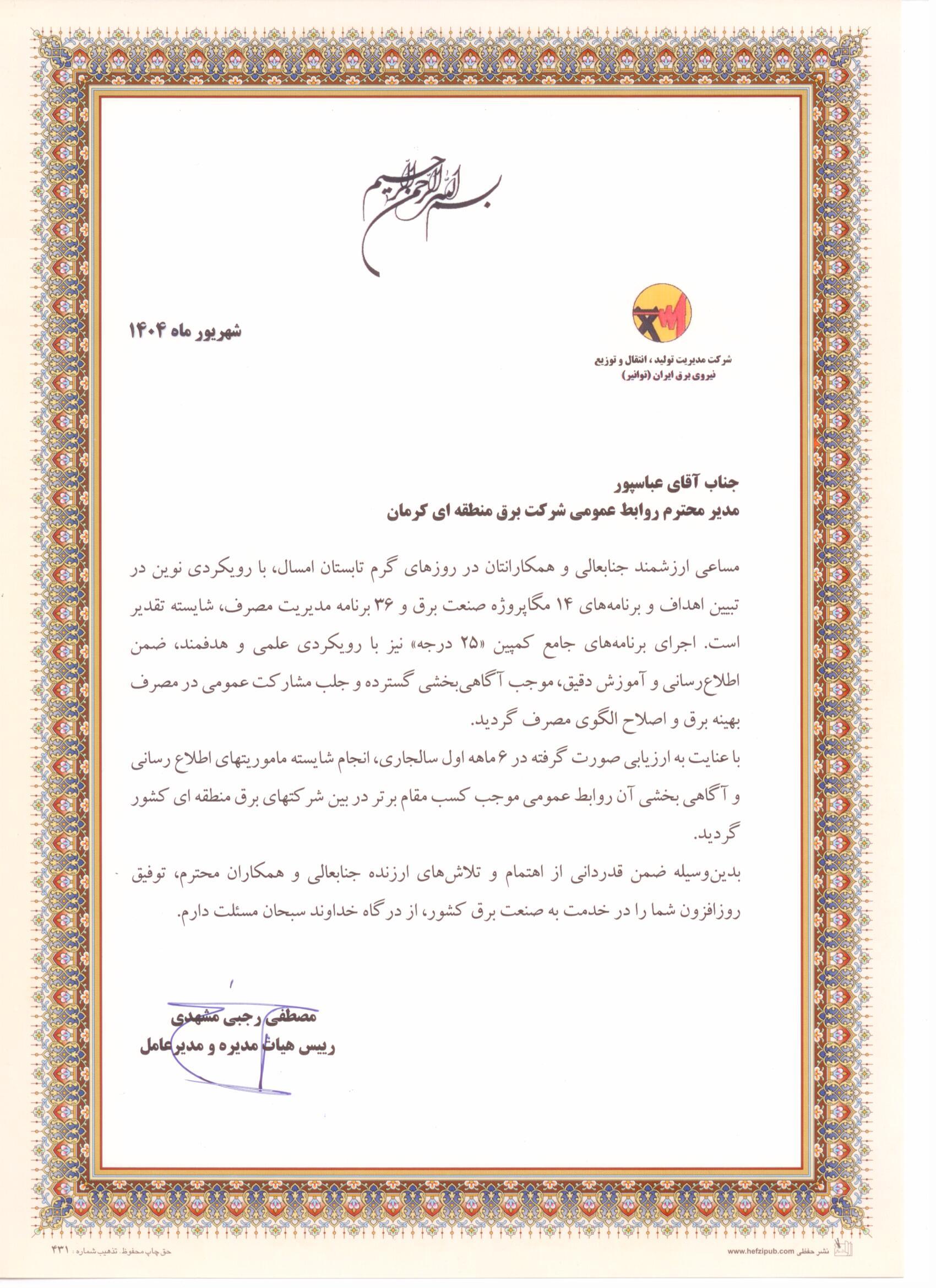 در همین راستا، طی لوحی به امضای مصطفی رجبیمشهدی، مدیرعامل و رئیس هیأت مدیره توانیر از خدمات محسن عباسپور، مدیر روابط عمومی شرکت برق منطقهای کرمان، قدردانی شد.