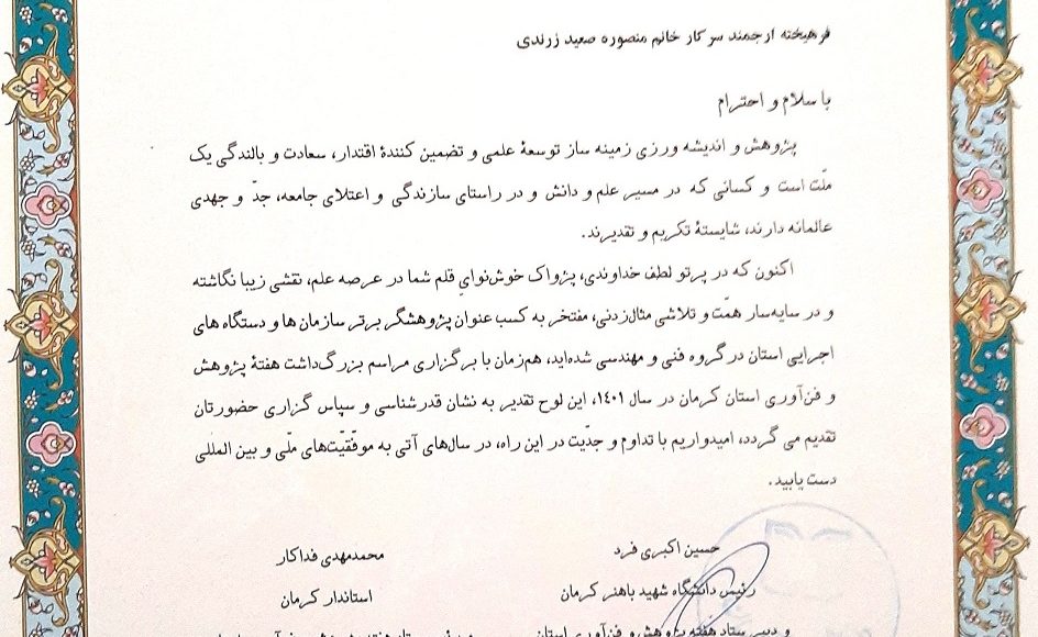 در مراسم نکوداشت پژوهشگران و فناوران برگزیده استان کرمان؛ دکتر منصوره صعید زرندی از شرکت برق منطقه ای کرمان به عنوان “پژوهشگر برتر درگروه فنی و مهندسی” معرفی و با اهداء لوح مورد تقدیر قرار گرفت.
